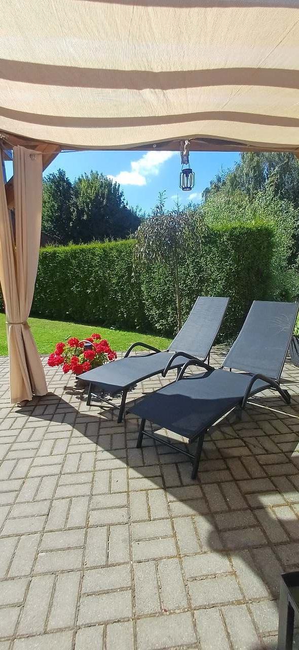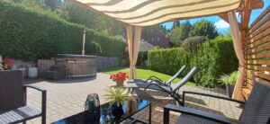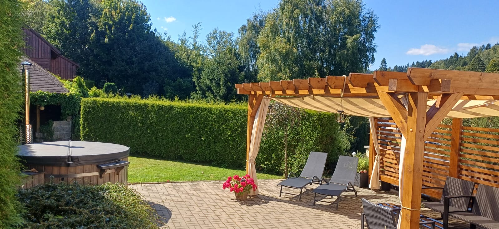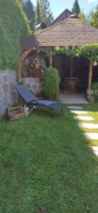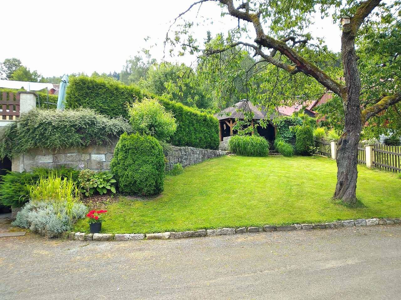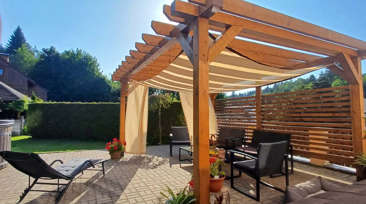 Zahrada s pergolou i altán s krbem pro teplé letní večery i chladné dny.