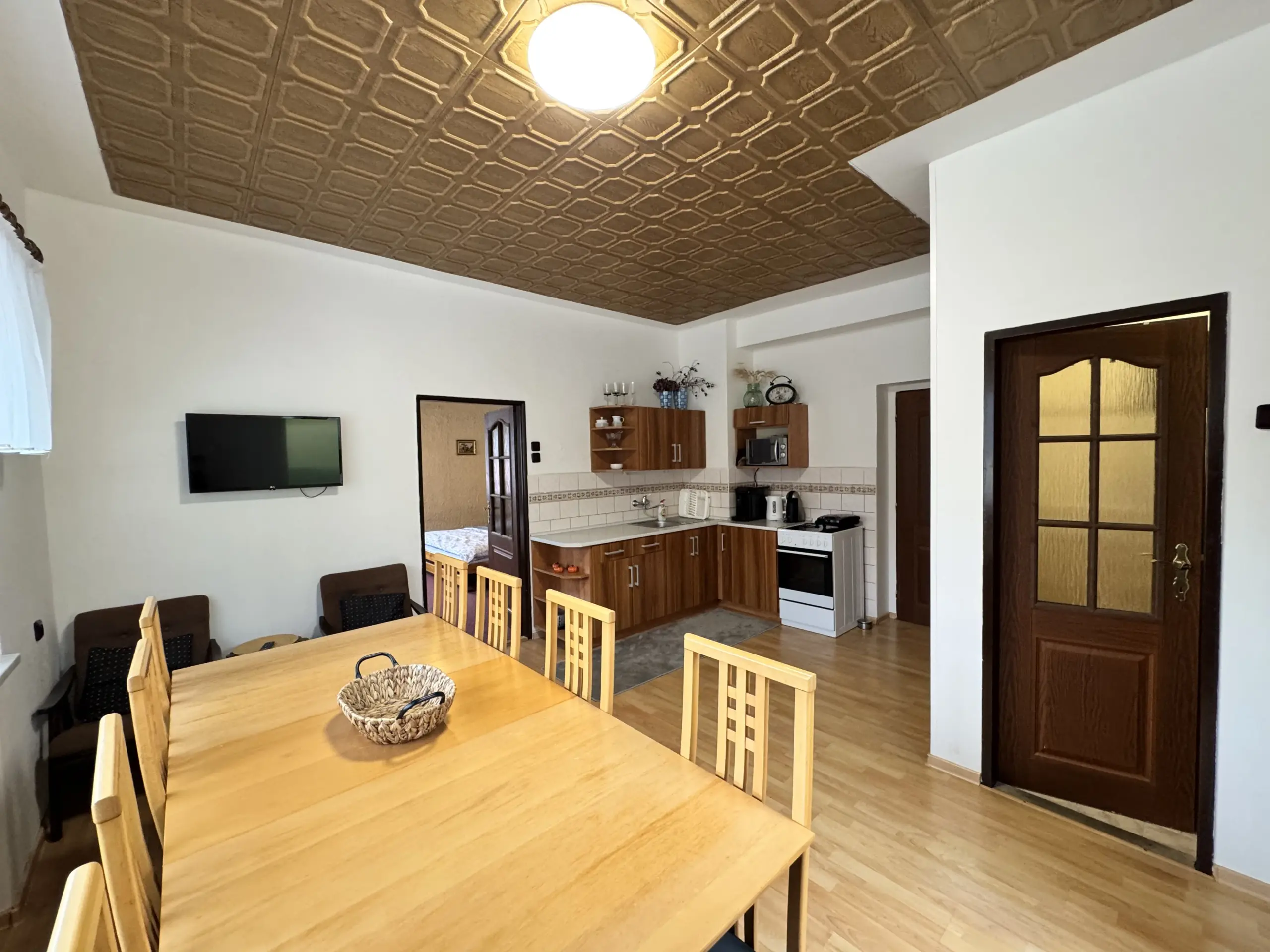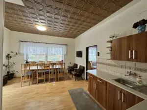 Plně vybavená kuchyň s jídelnou a vstupem na terasu.